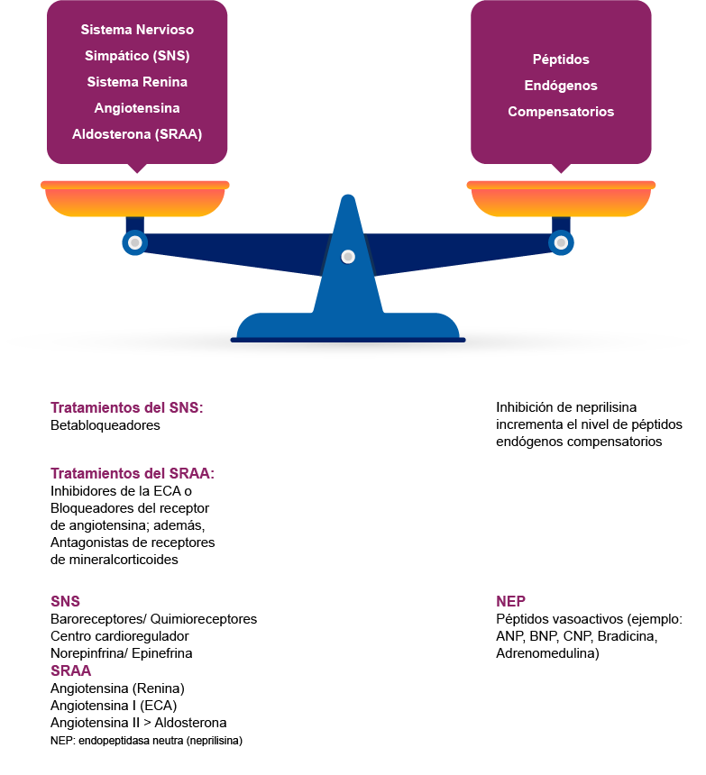 Varios sistemas neurohormonales contrarregulatorios ayudan a contrarrestar los efectos de estasobre activación continua. El más importante de estos es el regulado por los péptidos endógenoscompensatorios, el sistema de péptidos natriuréticos, cuyo efecto disminuye conforme la insuficienciacardiaca progresa, resultando en un desequilibrio neurohormonal, disminución continua de la funcióncardiaca y una inducción del remodelado cardíaco6.